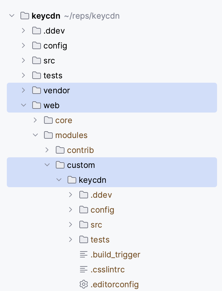 drupal/core-recommended becomes a dev dependency. This way the composer.json from the module is untouched.composer install so that dependencies are available. Additional arguments to ddev poser like --prefer-source are passed along to composer installweb/modules/custom) so Drupal can find your module. This command runs automatically on every ddev start as long as Composer has generated vendor/autoload.php which occurs during composer install/update. See codebase image below.ddev phpunit Run PHPUnit tests.ddev nightwatch Run Nightwatch tests, requires DDEV Selenium Standalone Chrome.ddev phpcs Run PHP_CodeSniffer.ddev phpcbf Fix phpcs findings.ddev phpstan. Run phpstan on project files.ddev eslint Run ESLint on JavaScript files.ddev stylelint Run Stylelint on CSS files.ddev core-version. Update your codebase to a newer or older version of Drupal core. More info.